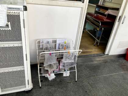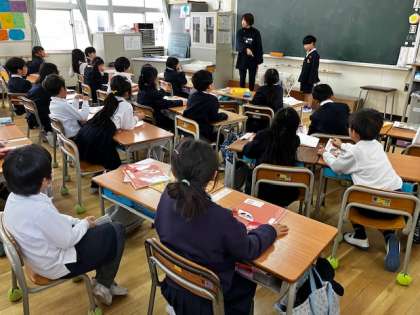 1年生の教室で。担任の先生から、ぞうきんかけに、一人できれいに並べてかけてくれていた子のことを伝えました。