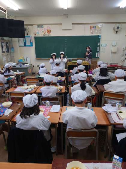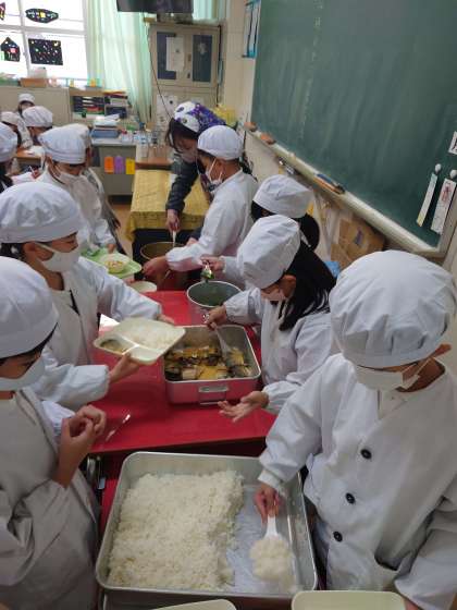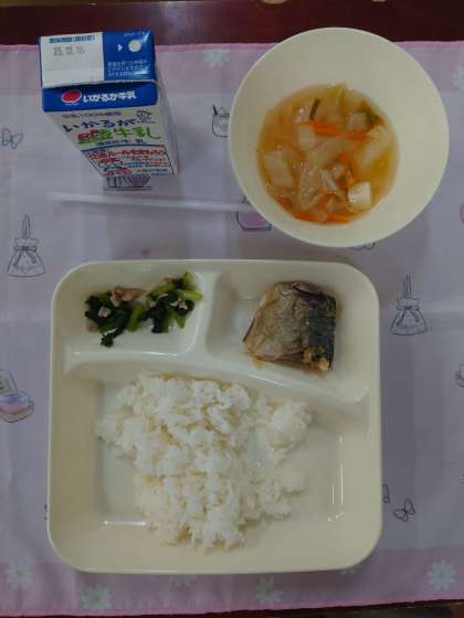 今日の献立は、すまし汁、小松菜のにびたし、サバのみぞれかけ、ごはん、牛乳です。