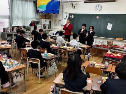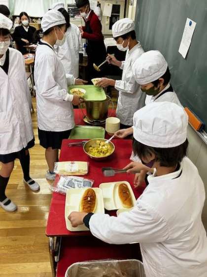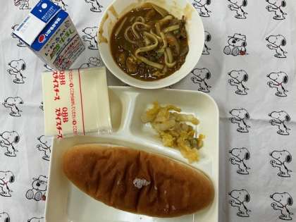 今日の給食献立は、コッペパン・カレーうどん・白菜のおひたし・スライスチーズ・ブルーベリージャム・牛乳です。