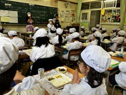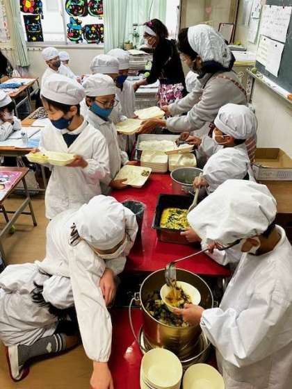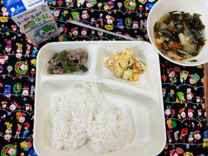 今日の給食献立は、ごはん・具だくさん卵の千草焼き・豚肉と三度豆の炒め物・五目汁・牛乳です。