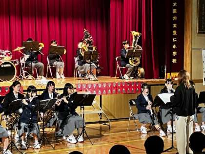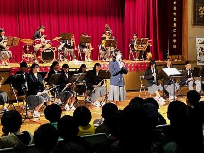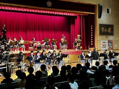 次は、新豊崎中学校音楽部の演奏です。クリスマス特集で〜す!ウキウキしますね!