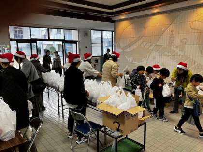 帰りに玄関でクリスマスプレゼントをもらって帰ります。お菓子とケーキが入っています!よかったね〜。