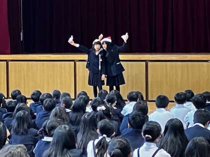 保健委員さんからは、保健委員会からのクリスマスプレゼントで、保健委員会で作ったカラフル石鹸を各教室に配りま〜す!とサンタ帽とトナカイ帽で伝えてくれました。