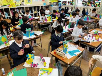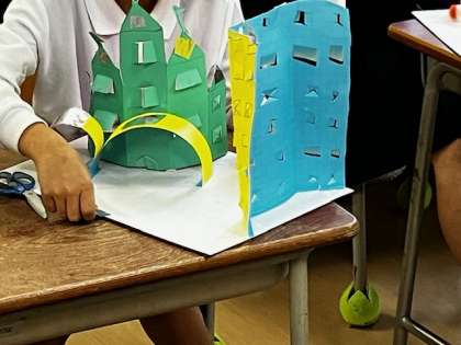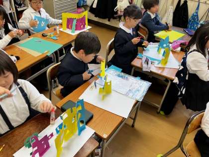 「窓を開いて」という題で、色画用紙で窓のある建物を作ります。それぞれの好きな建物が出来上がっていきます。こういう開放的な建物、いいですね〜!すばらしい!
