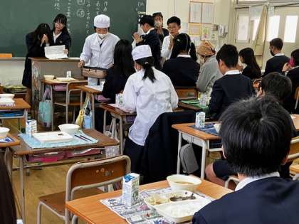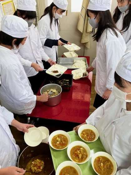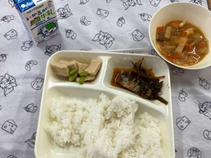 今日の給食献立は、ごはん・いわしのしょうが煮・高野豆腐の煮物・味噌汁・牛乳です。
