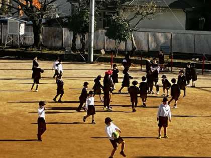 2時間めと3時間めの間の休憩は、15分で少し長めです。低学年が優先的に運動場の真ん中を自由に使えます。ドッチボールをしたり、オニゴをしたり。
