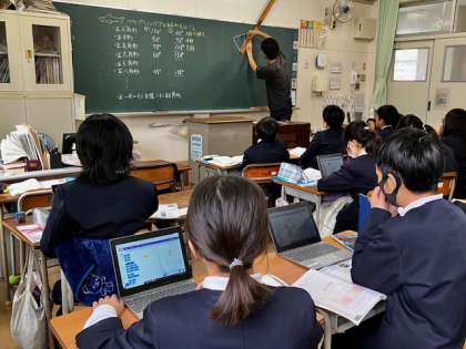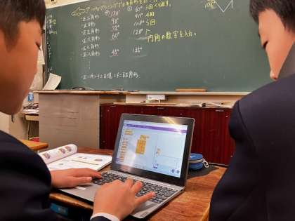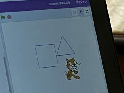 「プログラミングで正三角形を描こう」みんな、真剣にパソコンに向かっています。すごいですね〜!拒否感ゼロ、みんなできそう〜!みたいな雰囲気です。