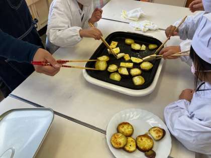 切った芋をホットプレートでバター焼きにします。子どもたちは芋をひっくり返して焼きます。最初はおはしでつかむのが難しいようでしたが、慣れると上手につかんで、どんどんひっくり返していました。