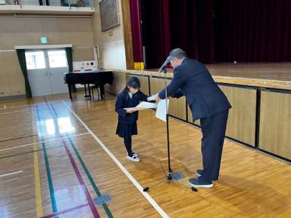 今日は月曜日、児童朝会の日です。はじめに、「みどりの絵コンクール」の表彰がありました。
