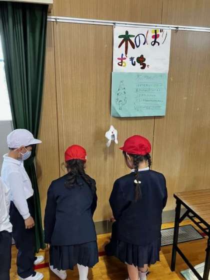 「木のぼりおもちゃ」ひもを引っ張るとアラ不思議、動物が登っていきます。よくできています!