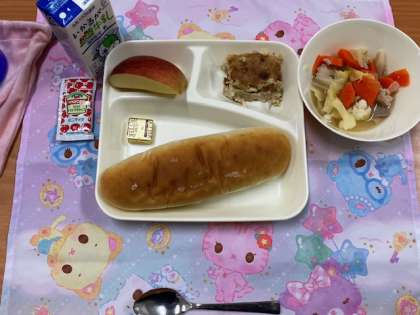 今日の給食献立は、コッペパン・豆腐ロール・カリフラワーのスープ煮・りんご・バター・牛乳です。