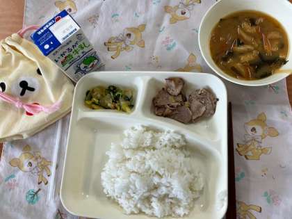 今日の給食献立は、ご飯・豚肉の葱醤油焼き・菊菜と白菜の胡麻和え・味噌汁・牛乳です。
