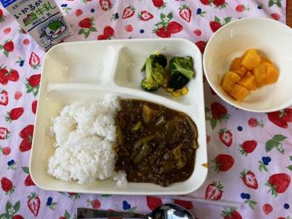 今年最後の給食献立は、冬野菜のカレーライス・ブロッコリーとコーンのサラダ・黄桃(カット缶詰め)・牛乳です。