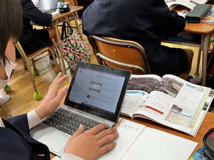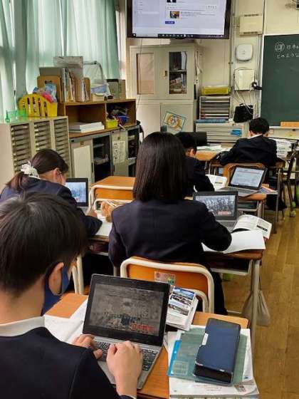 学習している時代をについて、それぞれのパソコンでいろんな背景を調べています。教科書に書いてあることの背景にある様々なことがわかってきます。