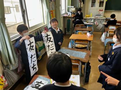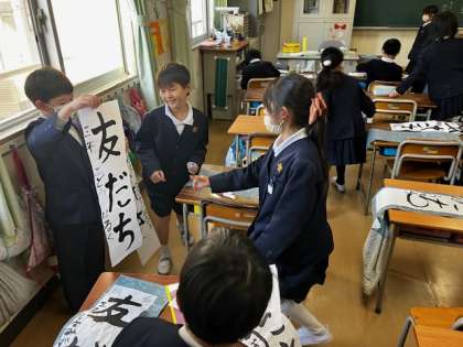 書初めができました。全員の書初めを台紙に貼って教室に掲示します。