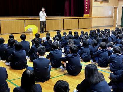 まず初めに、今回はPTAの役員さんに来ていただいて、貸し傘のお話をしていただきました。
