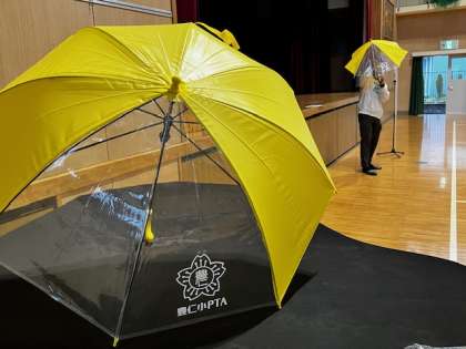 これまで持ち主不明の傘を貸し傘にしてきましたが、PTAから豊仁小のロゴと校章入りの傘を寄贈していただきました。