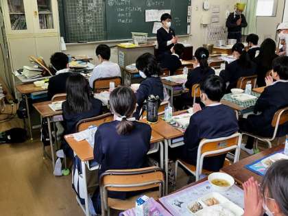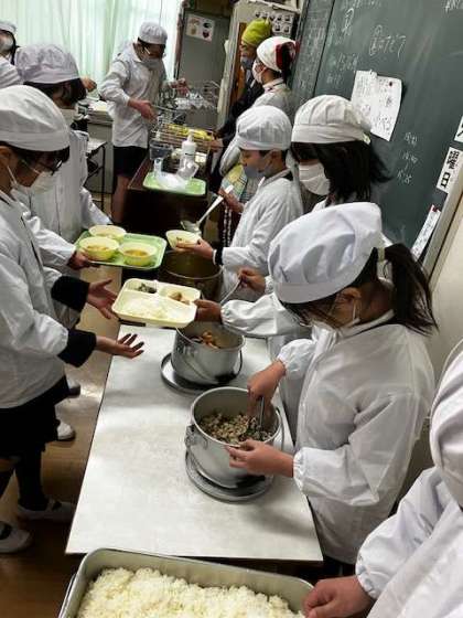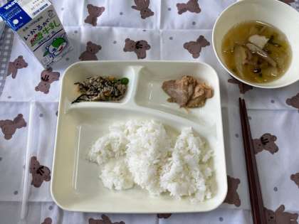 今日の給食献立は、ごはん・鶏肉の甘味噌焼き・高野豆腐の炒り煮・五目汁・牛乳です。