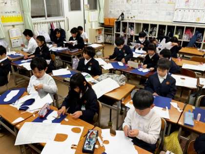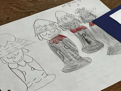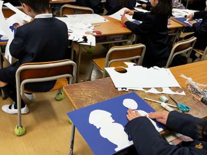 2年生で「傘こ地蔵」の紙版画に取り組んでいます。国語の教科書で習った「さかこじぞう」の場面を紙版画にします。