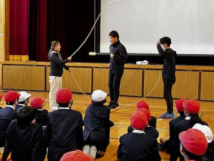 今日は、ダブルダッチ。2本の縄跳びで、ミラクルな跳び方をする競技です。今回のゲストティーチャーは、2016年のダブルダッチ世界チャンピオンのファットクルーというチームからお二人に来ていただきました。