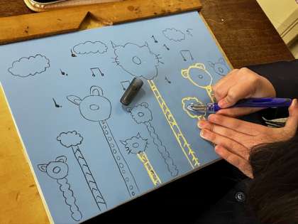 楽しい花がいっぱい咲いています。彫刻刀の使い方にヒヤヒヤしますが、今の版画作業台は、机に引っかかるようになっていたり、削った木屑を、溜める穴があったり、安全・便利にできています。