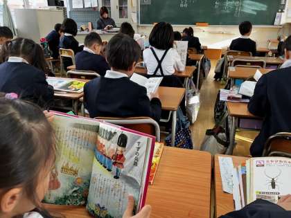 全員が黙って読書します。家から持ってきた本、学級文庫の本、図書館で借りた本など、好きな本を読みます。