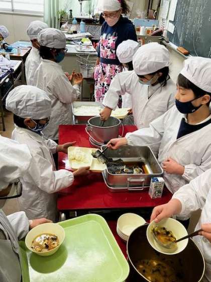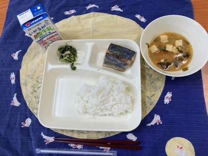 今日の給食献立は、ごはん・さごしの醤油だれかけ・水菜の煮びたし・豆腐の味噌汁・牛乳です。