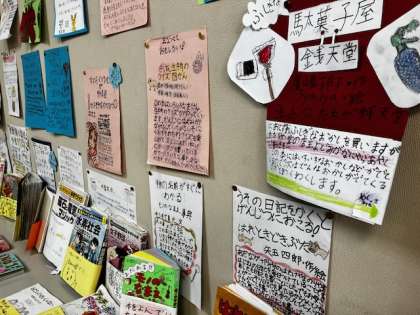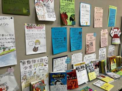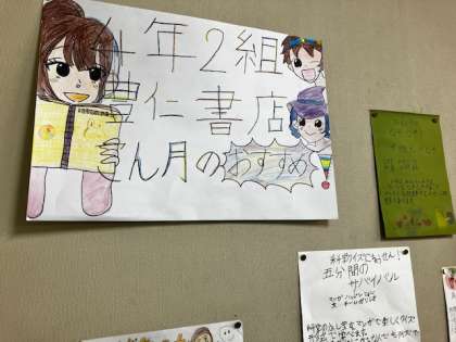 4年生の教室には、子どもたちがおすすめの本を丁寧に絵入りで紹介してくれているポスターが掲示されています。