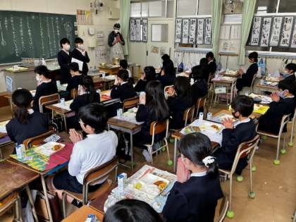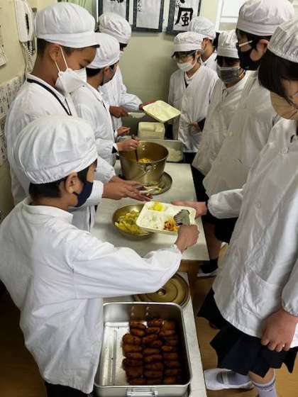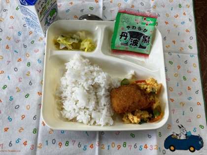 今日の給食献立は、カツ丼・白菜の甘酢和え・ソフト黒豆・牛乳です。
