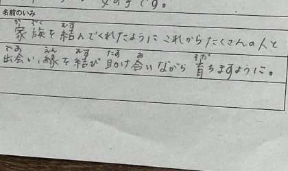 自分の名前の由来、親の思いもおうちで書いてきていただいています。一人ずつのを読ませてもらったら、感動でした!