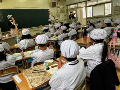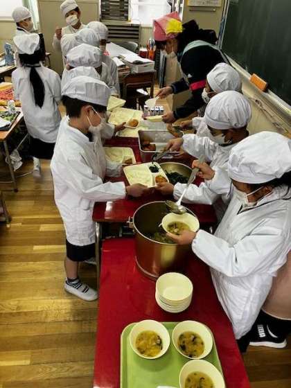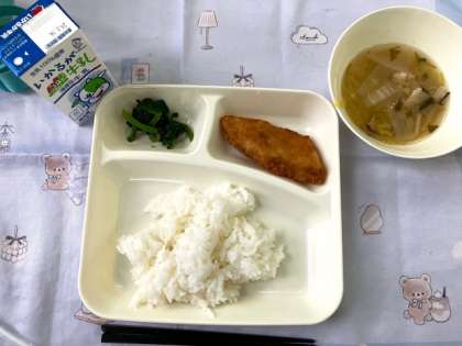 今日の給食献立は、ごはん・鱈(たら)のフライ・ほうれん草のおひたし・うすくず汁・牛乳です。