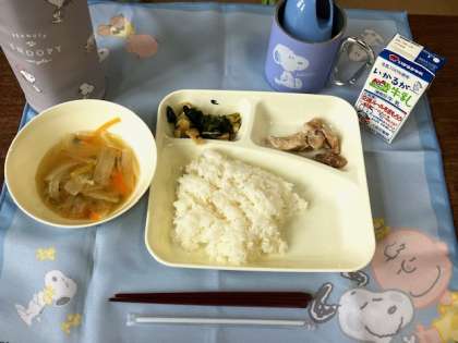 ごはん・鶏肉のなにわ甘辛ソースかけ・小松菜の炊いたん・船場汁・牛乳です。船場汁は問屋街である船場で生まれたものです。