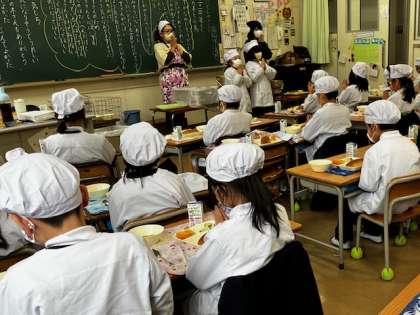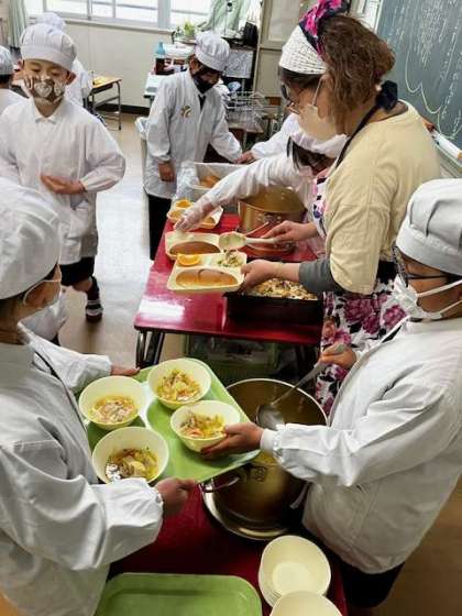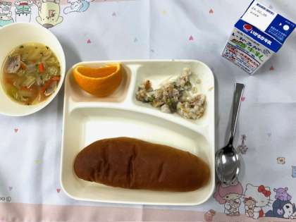 今日の給食献立は、黒糖パン・押麦のグラタン・豚肉と野菜のスープ・デコポン・牛乳です。