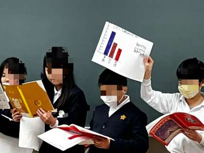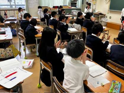 4年生の国語の授業。班ごとに調べたいことを調査して、統計をとって発表するという取組みをしています。