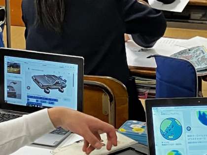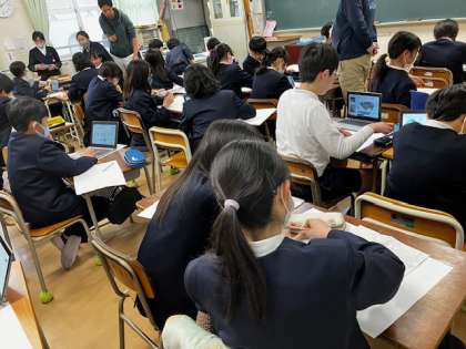 5年生の教室。「未来の街」をテーマに想像した絵を描きます。