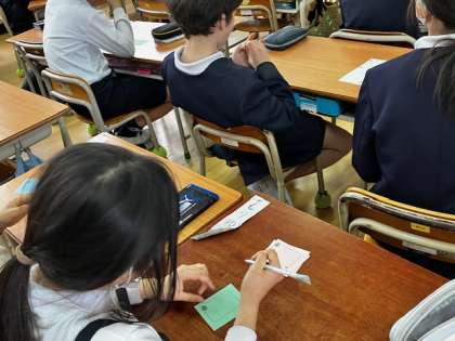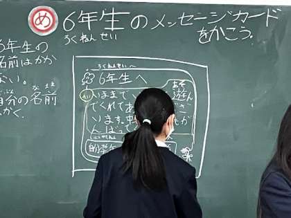 6年生に渡すプレゼントづくりをします。縦割り班の6年生に全員でメッセージを書きました。