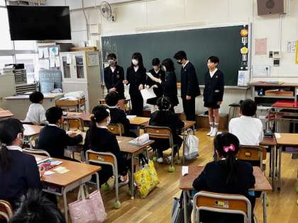 3時間め、6年生以外の全校児童が縦割り班ごとに分かれて教室に集まりました。