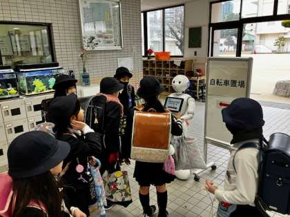 先日は新入生保護者説明会の際に、講堂前で案内役を務めてくれました。今日は、北区の先生方の集まる会議の案内役を玄関で頑張ってくれました。今回はちょっと陽気な声で案内役をしてくれて、来校された先生方の評判は上々でした!
