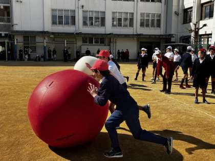 借り物リレーや、棒引き、大玉転がし。借り物リレーでは、保護者を連れ出して一緒に走ります。速く走る子には、担任から「速すぎる〜!保護者の方がこけてしまうやろ〜!」と指導が入ってました。