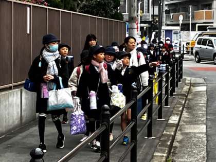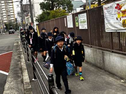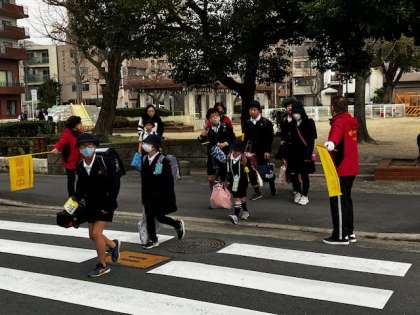 今日から、新登校班での登校です。卒業を控えた6年生から、バトンを引き継いだ新班長が、少し緊張感を持ちながら下級生を導いて登校してきました。