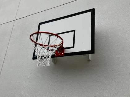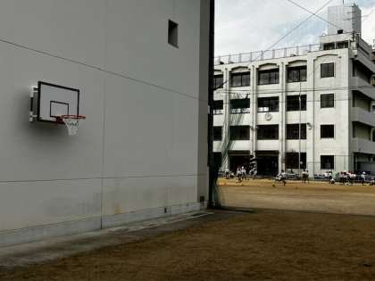 今日、体育館横にバスケットゴールが取り付けられました。