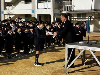 最初に、表彰の紹介をしました。歯科医師会主催の「歯と口の健康、図画・ポスターコンクール」で5年生が入賞しました。おめでとうございます。