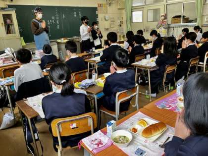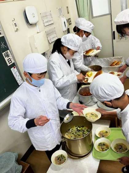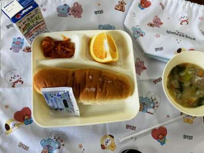 今日の給食献立は、コッペパン・えびのチリソース炒め・中華がゆ・はっさく・ブルーベリージャム・牛乳です。