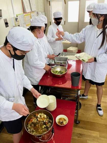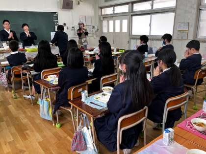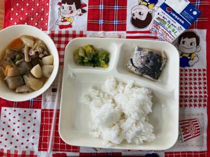 今日の給食献立は、ごはん・さごしのおろし醤油かけ・菜の花のおひたし・里芋と野菜の含め煮・牛乳です。
