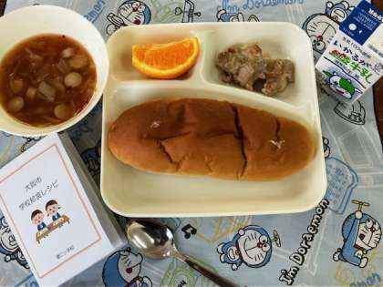 最後(6年生にはですが)の給食献立は、黒糖パン・鶏肉とじゃがいものガーリック焼き・ウインナーとてぼ豆のスープ・デコポン・牛乳です。