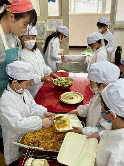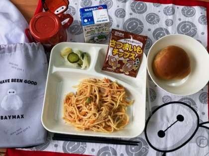 今年度のラス前給食献立は、黒糖パン(2分の1)・鮭のクリームスパゲッティ・キャベツときゅうりのサラダ・おさつチップス・牛乳です。