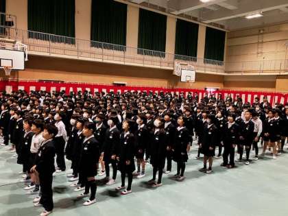 今日は、今年度の修了式を行いました。全員で校歌を歌って、各学年の代表に修了証を渡しました。