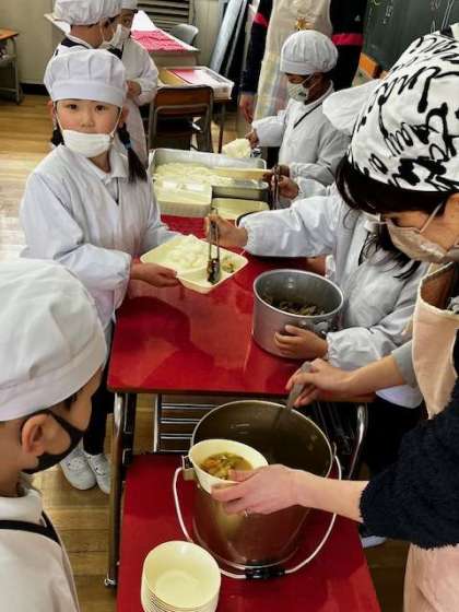 今年度最後の給食献立は、豚肉の生姜焼き・切干大根の柚子の香和え・さつま芋の味噌汁・牛乳です。