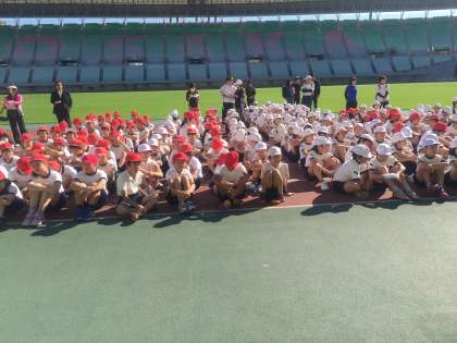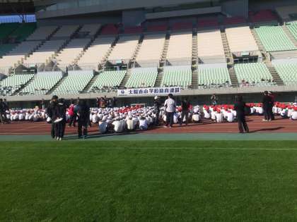 長居陸上競技場「ヤンマースタジアム」に北区の小学校11校と都島区の桜宮小学校の6年生が集まってスポーツ交歓会を行ないました。