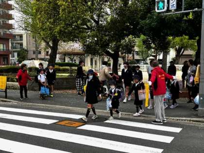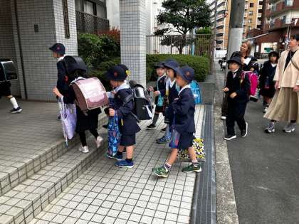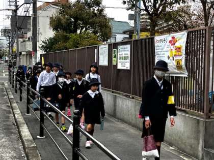 今日から新しい学年が始まります。みんな、時間通りにちゃんと集団登校してきました。1年生はまだまだ心配なので保護者の方が一緒に来てくださったりしています。